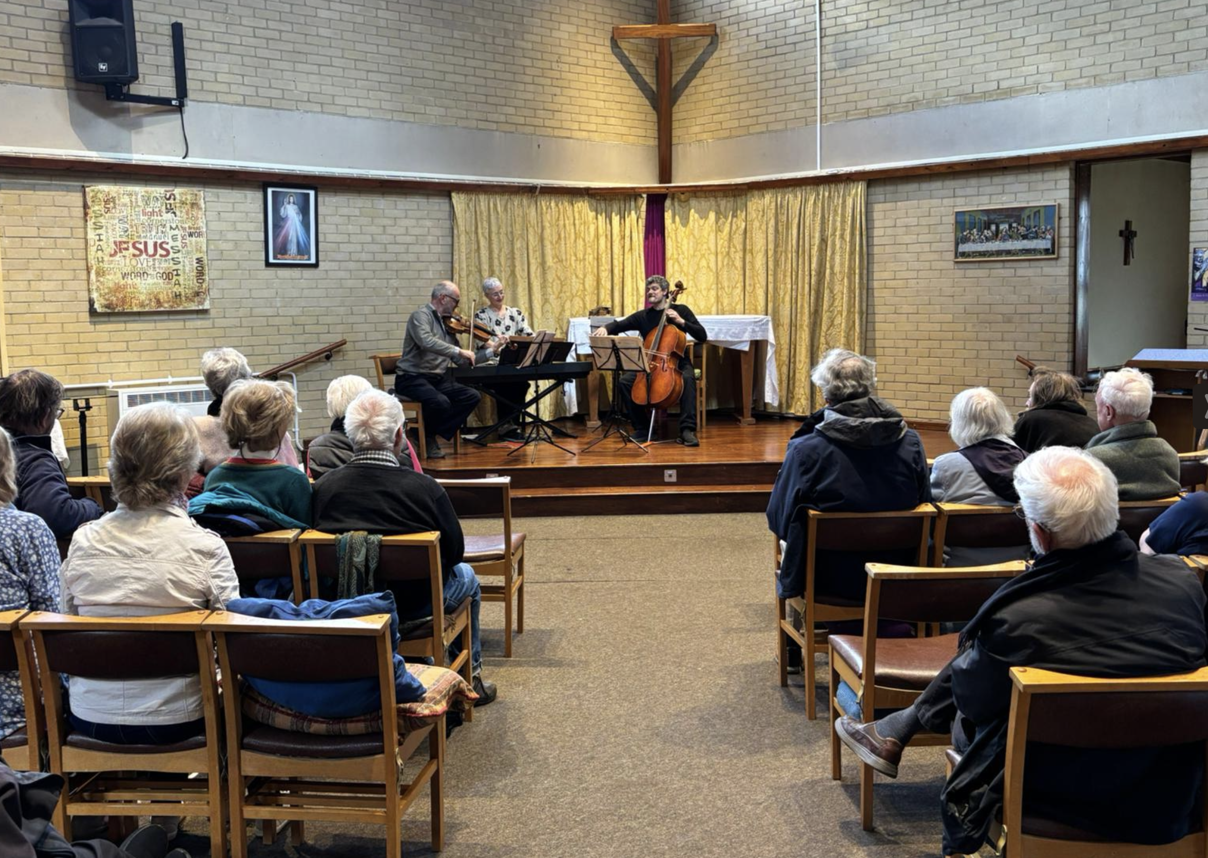 Today’s audience successfully dodged the showers to attend Reza’s lunchtime concert with Anna, Matt & Pavlos. We were treated to a wonderfully varied programme featuring Haydn, Boccherini and Scarlatti, as well as the world première of one of Anna’s own amazing compositions entitled ‘Out of the Blue,’ which she wrote for Pavlos & Matt. One young man decided to celebrate his 18th birthday with us and received a rousing Happy Birthday from the musicians and the audience!